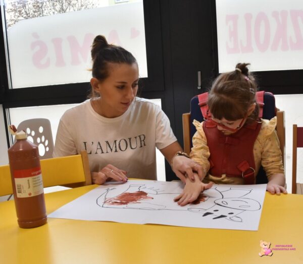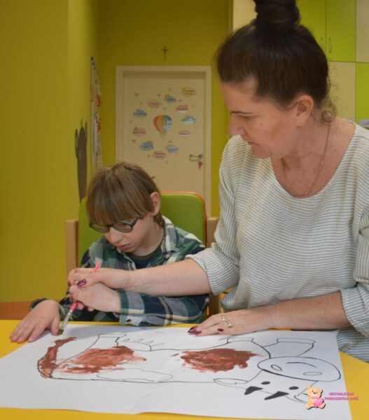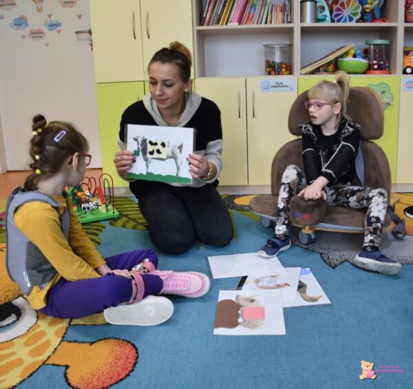 W raz z pomocą cioć powstała praca plastyczna w postaci krowy, której łaty odbijaliśmy swoimi rączkami umoczonymi w farbie ćwicząc motorykę małą.![]()