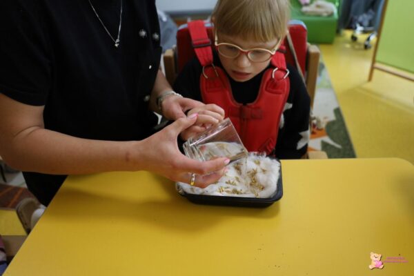 W minionym tygodniu Amisiaki zapoznały się rodzajami prac wykonywanych w ogrodzie oraz ze sprzętem jaki używamy do tego celu. Przedszkolaki wzięły się do pracy i założyły swój przedszkolny ogródek sadząc cebulki kwiatów oraz siejąc owies na wacie. Ćwicząc motorykę małą Perełki wykleiły cebulę kolorową bibułą. Podczas zabaw ruchowych dzieci spacerowały między grządkami wrzucając nasionka do ziemi. Przedszkolaki wykonały również eksperyment z barwieniem liści kapusty, który pokazał dzieciom, że rośliny potrzebują do życia wody.