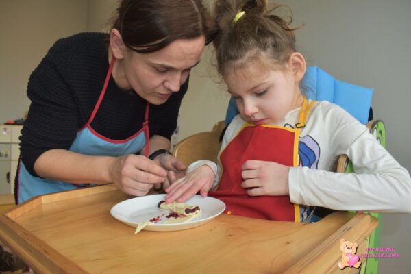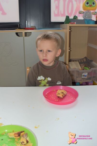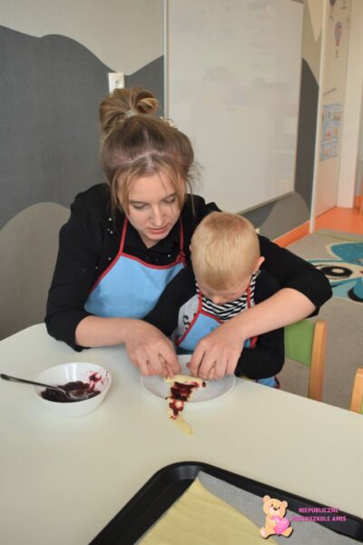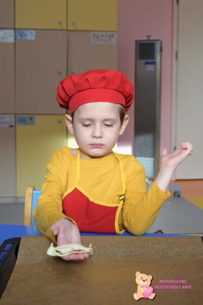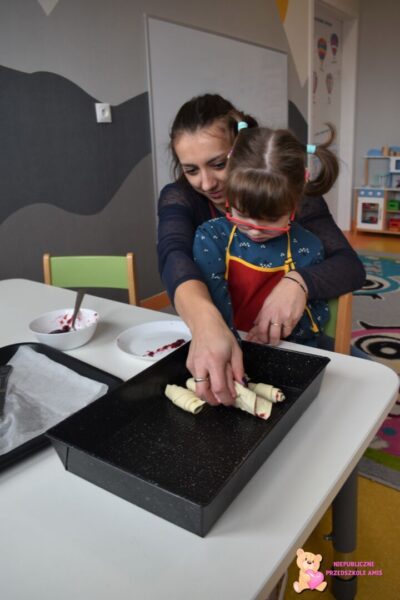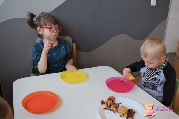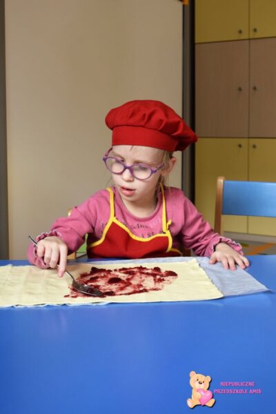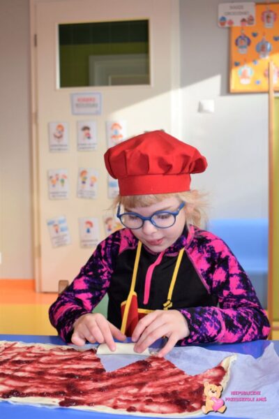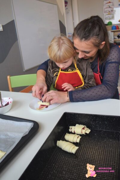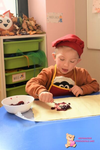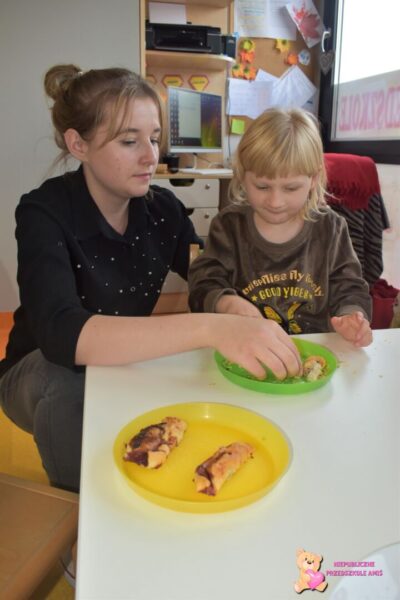 Przedszkolaki na kolejnych zajęciach z kuchcikowa wykonały „amisiowe” rogaliki. Z ciasta francuskiego wykroiliśmy trójkąty, na które nałożyliśmy słodki farsz. Później za sprawą swoich małych raczek zwijaliśmy od szerszego miejsca , ku cienkiej końcówce. Tak wykonane i upieczone rogaliki zajadaliśmy ze smakiem.