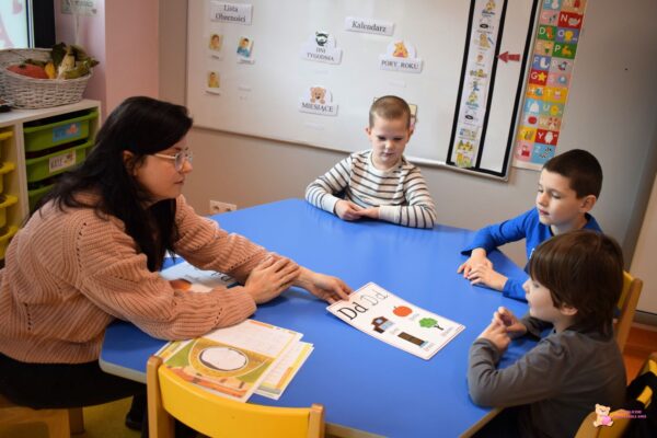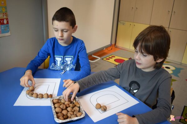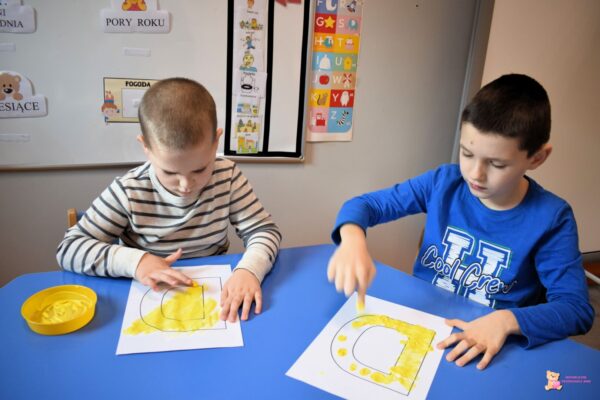 Przedszkolaki przypomniały sobie także kształt małe i dużej litery „D”. Za pomocą paluszków malowali kontury tej litery oraz literowali wyrazy zaczynające się literę „D”. Ćwiczyliśmy także motorykę małą rysując i pisząc po śladzie.