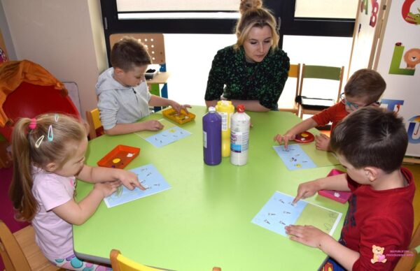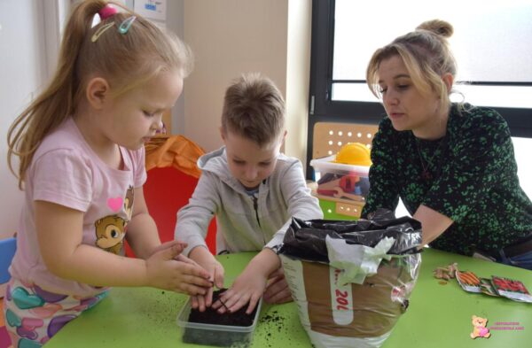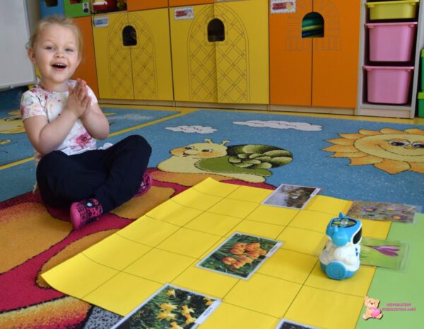 Dzieci poznały, czym różnią się cebule, cebulki i nasiona. Następnie posadziły i posiały je w ziemi, tworząc w Sali kącik uprawny. Poznały także rośliny, które możemy spotkać w wiosennym ogrodzie. Poznały narzędzia, dzięki którym można uprawiać ogródek. Rozwijały także umiejętności matematyczne poprzez dobieranie w pary liczb oraz oczek na kostce. Ćwiczyły też liczenie na konkrecie w zakresie 10. Chętnie ćwiczyły również kodowanie z wykorzystaniem robota. Na koniec tygodnia uczestniczyły w zabawie logorytmicznej, podczas której ćwiczyły koordynację wzrokowo- słuchową, rozpoznając brzmienie poszczególnych instrumentów oraz utrwalały znajomość liter.![]()