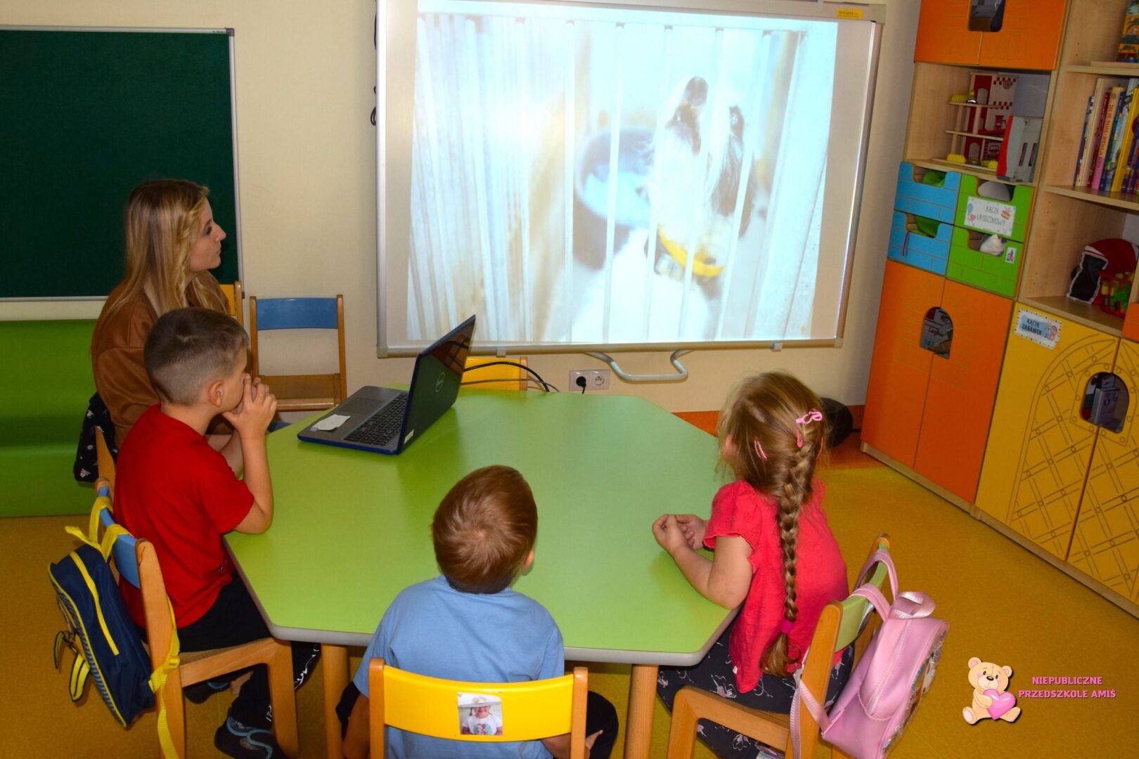 korzystały z tablicy multimedialnej, oglądając filmik o zwierzętach w schronisku,