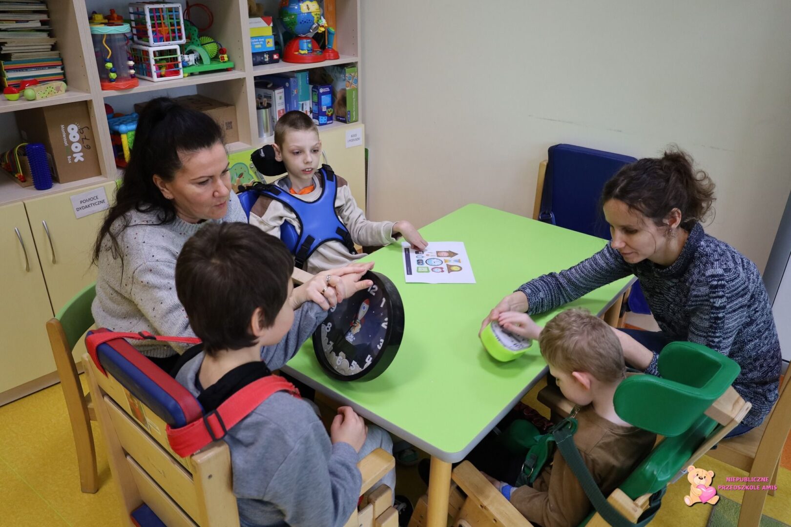 W ostatnim dniu przybliżyliśmy sobie rodzaje zegarów oraz ich zastosowanie. Chłopcy z zainteresowaniem oglądali oraz wsłuchiwali się w dźwięki zegarów. Poznali, ze każda ze wskazówek ma swoje znaczenie oraz, ze zegarki elektroniczne też wskazują godziny, mimo ze nie posiadają wskazówek. Wspólnie wykonali zegar do nauki odczytywania godzin.