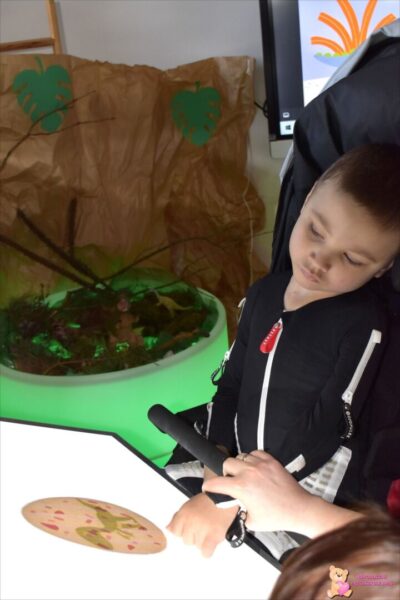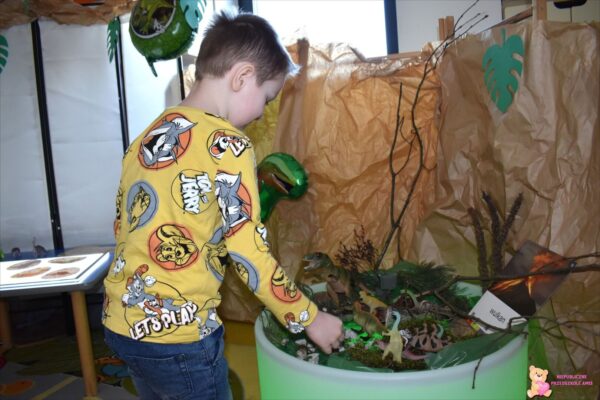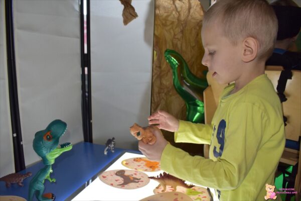 . Przedszkolaki mogli poczuć się jak mali paleontolodzy szukający skamieniałości dinozaura w piasku. Za pomocą tablicy podświetlanej sprawdzaliśmy jak wyglądają małe dinusie oraz przenieśliśmy się w świat jurajski za sprawą okularów 3D.