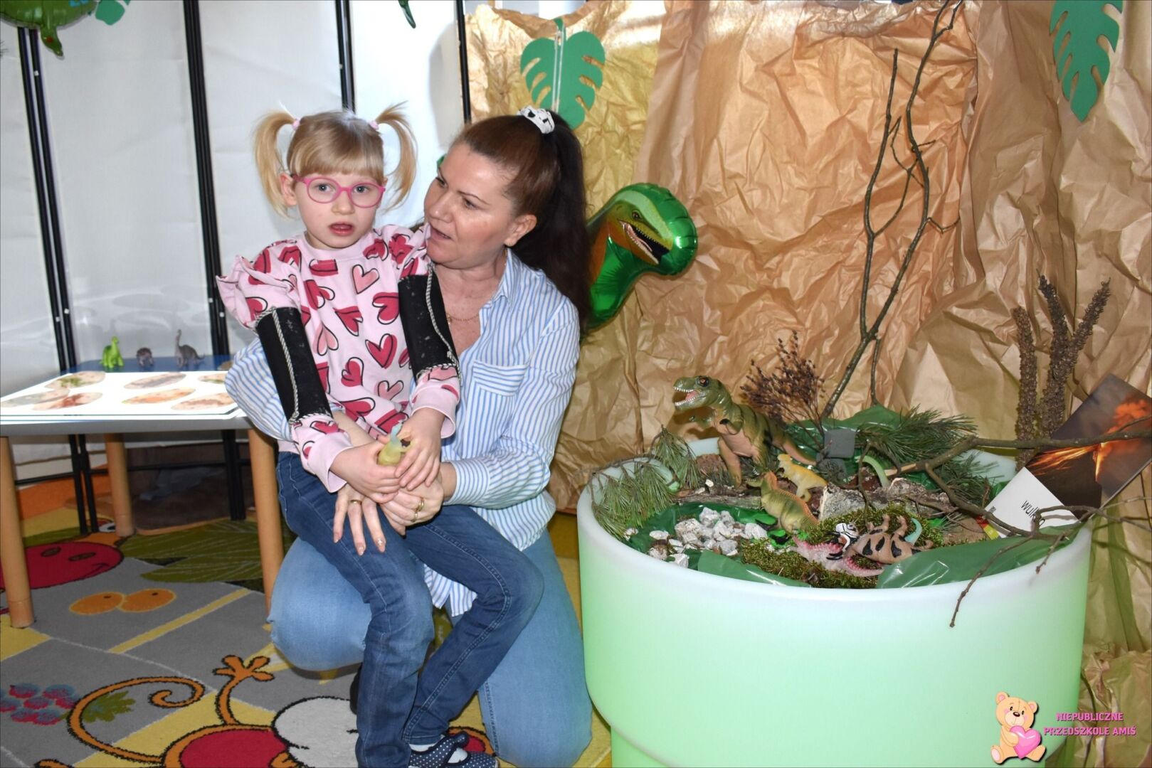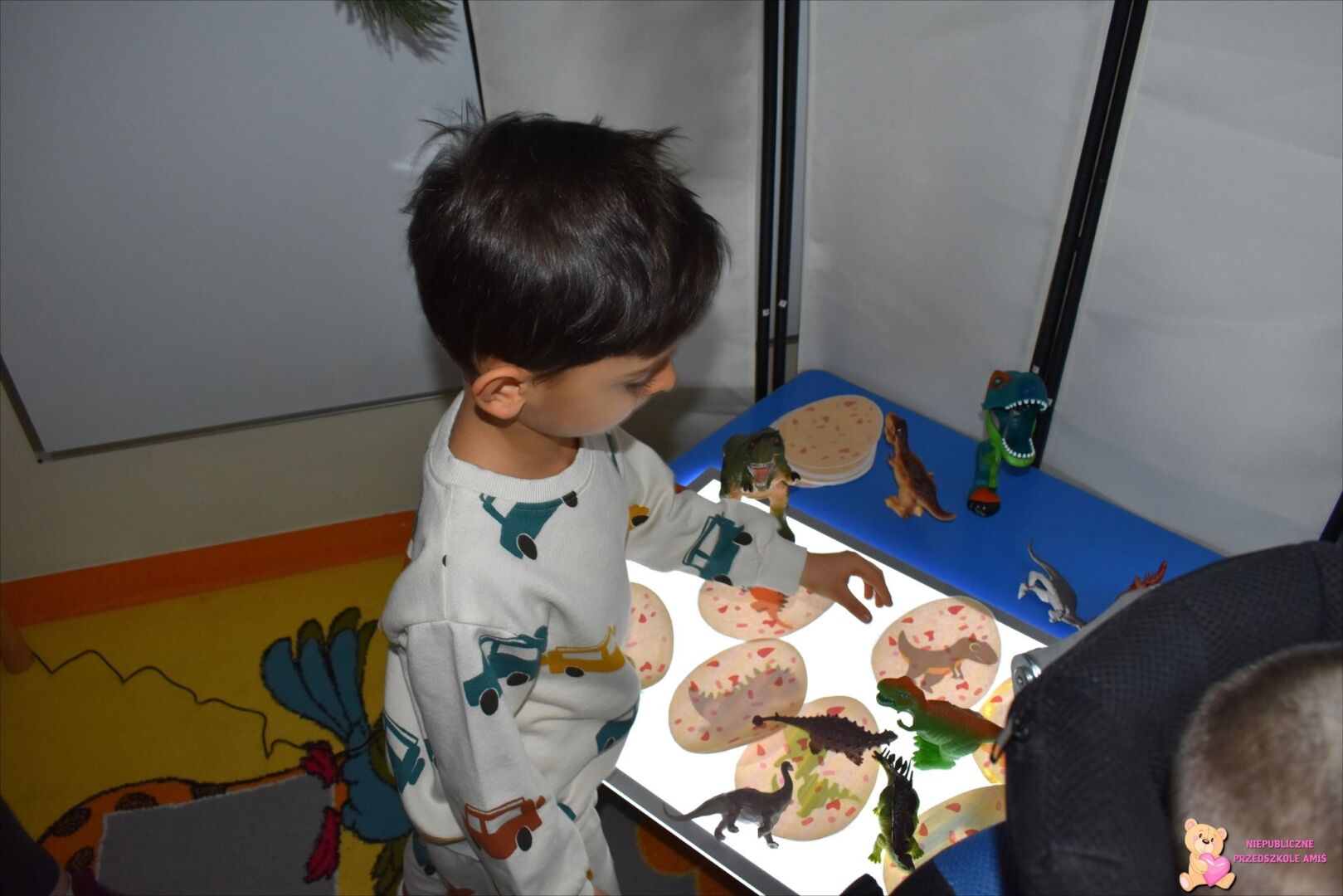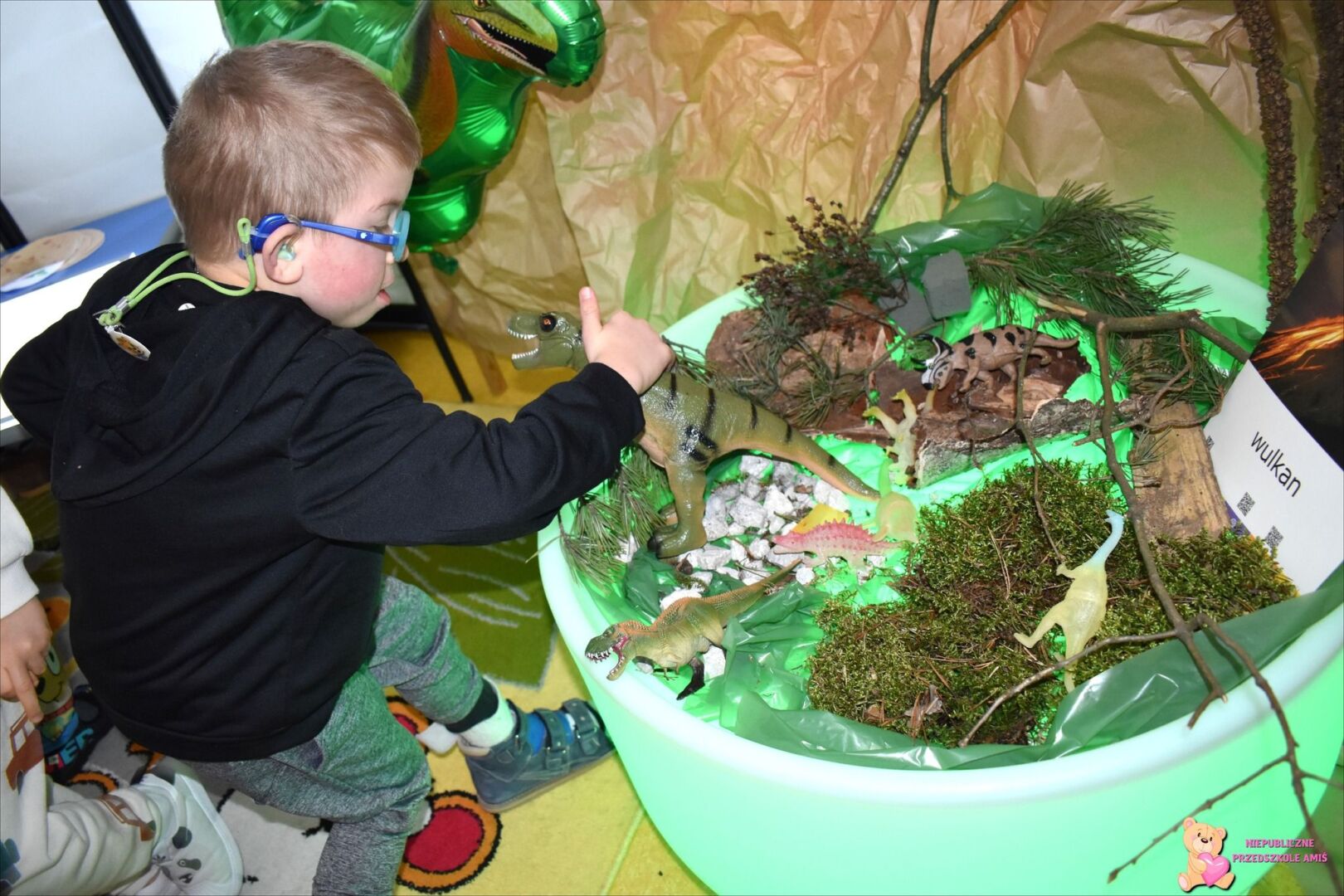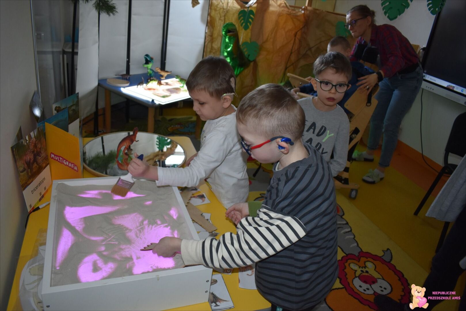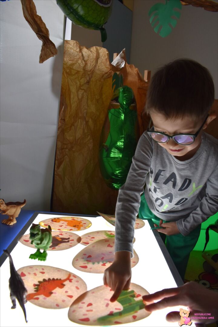 . Przedszkolaki mogli poczuć się jak mali paleontolodzy szukający skamieniałości dinozaura w piasku. Za pomocą tablicy podświetlanej sprawdzaliśmy jak wyglądają małe dinusie oraz przenieśliśmy się w świat jurajski za sprawą okularów 3D.