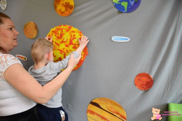 W minionym tygodniu przedszkolaki z grupy Perełek brały udział w zajęciach związanych z Kosmosem i Układem Słonecznym. Rozmawialiśmy o porze dnia i nocy, poznawaliśmy planety jakie krążą wokół Słońca. Z pomocą cioć stworzyliśmy kolorową lunetę, a także braliśmy udział w zabawie badawczej „Lot balonem”.