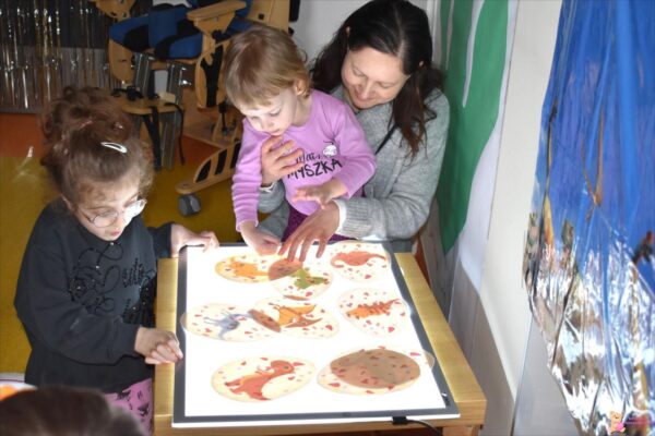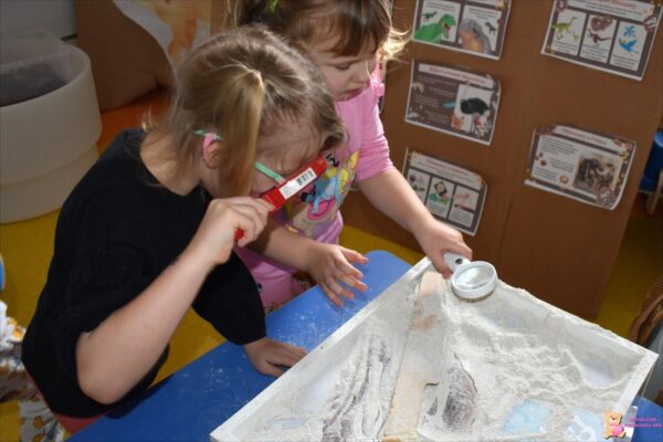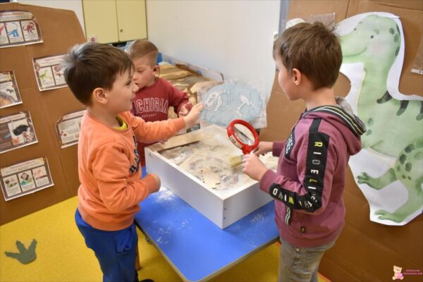 Nasze przedszkolaki obchodziły dzień Dinozaura. Każdy mógł się przenieść w prehistoryczny świat. Mogliśmy być paleontologami i odkopywać szkielety , jak również wyciągać z masy sensorycznej . Amisiaki z zaciekawieniem oglądały jajka na tablicy podświetlanej i gazetkę. Na pamiątkę każdy otrzymał drobny prezencik w postaci magnesowej monstery.