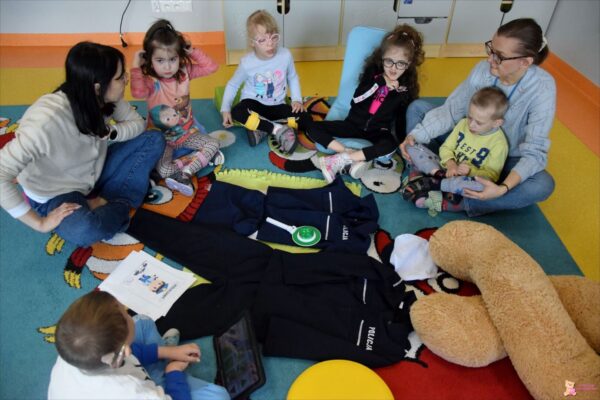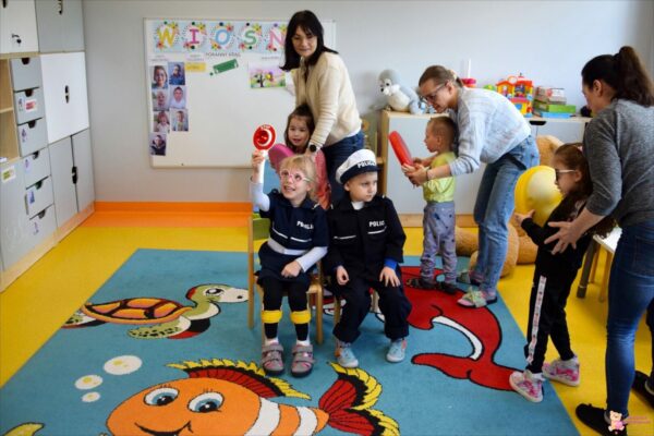 podczas pracy potrzebują oraz jak są ubrani. Najbardziej wszystkim podobał się lizak, którego używa policjant. Poznaliśmy ważny numer 112 oraz numery policji–997, straży pożarnej – 998 i pogotowia–999. Rozmawialiśmy o pracy lekarza i pielęgniarki. Zastanawialiśmy się, w jakich okolicznościach spotykamy się z lekarzem