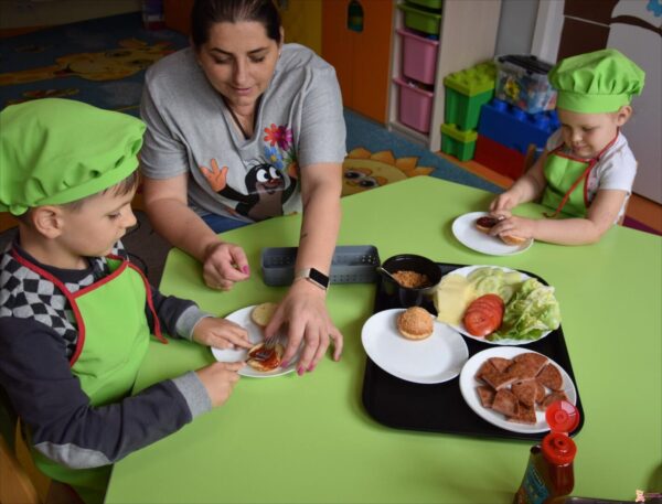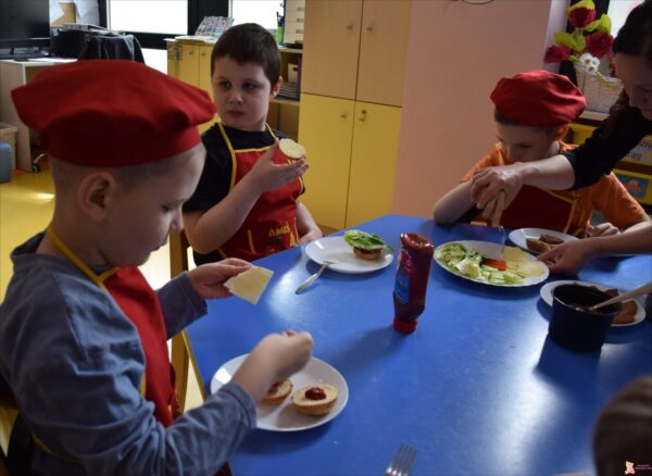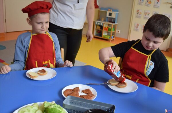 Zajęcia były nie tylko pyszną przygodą kulinarną, ale także doskonałą okazją do rozwijania samodzielności, kreatywności oraz współpracy w grupie. Na zakończenie wszyscy z apetytem zjedli własnoręcznie przygotowane hamburgery🍔🍔 i wspólnie świętowali ten smakowity dzień.
