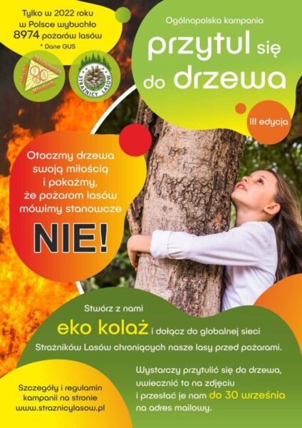 Przedszkolaki również w tym roku włączyły się do III edycji Ogólnopolskiej Kampanii „PRZYTUL się do DRZEWA”, zorganizowanej przez „Strażnicy Lasów – Fabryka Aktywności Młodych” #straznicylasow . Podczas spaceru chętnie przytulaliśmy się do drzew. Akcja ta ma celu zwrócenie uwagi na bezpieczne i mądre poruszanie się po lasach, uczula na rzeczy, które mogą nieświadomie doprowadzić do pożaru.