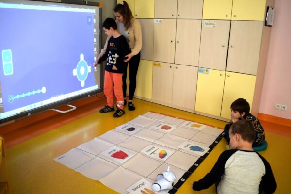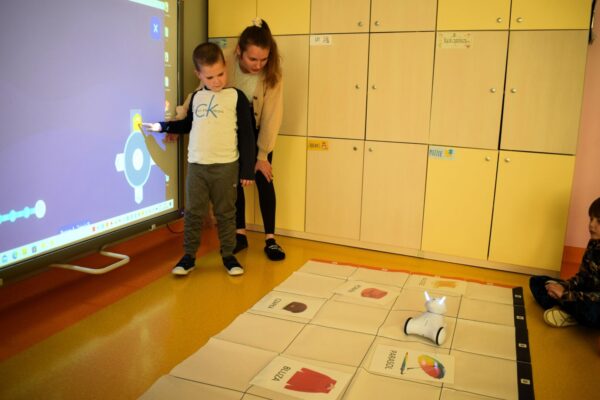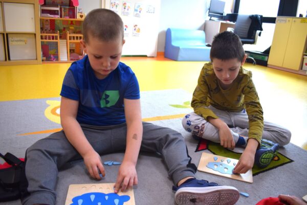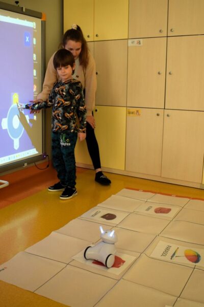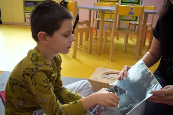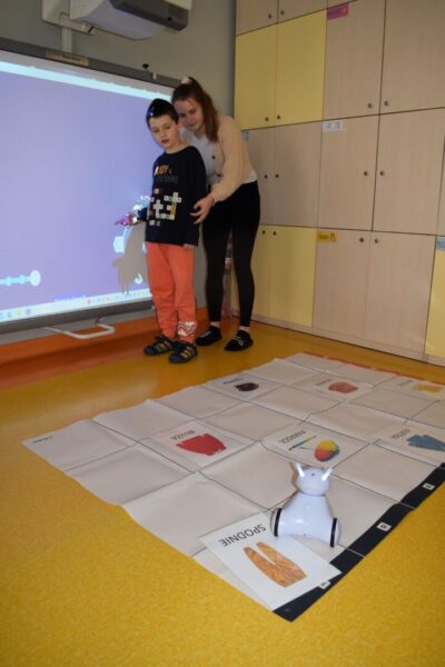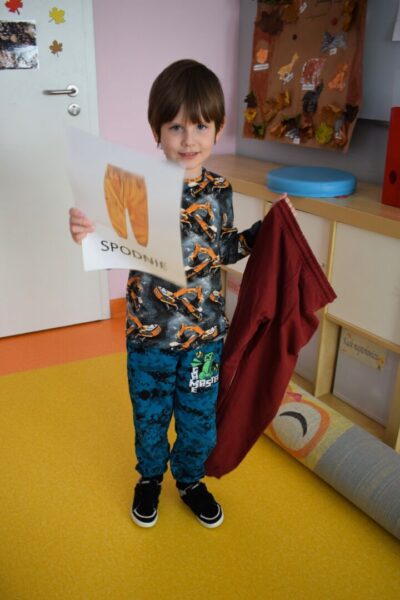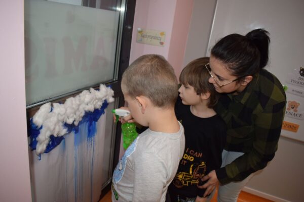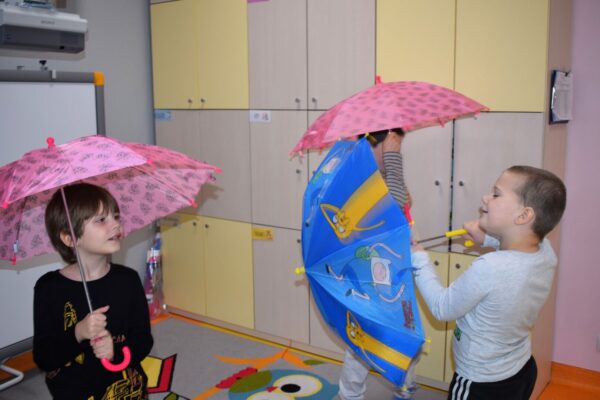 Przedszkolaki z grupy „Zajączków” w tym tygodniu przypominały sobie wiadomości o zmianach nadchodzących w przyrodzie późna jesienią. Podczas zajęć utrwalały wiedzę o tym, skąd biorą się kałuże oraz rozwijały słownik czynny i słuch fonematyczny. Z dużym zainteresowaniem dzieci brały udział w zajęciach z robotem „Photon”. Z pomocą cioci Natalii dzieci mogły sterować robotem przy użyciu tablicy multimedialnej. Każdy mógł wybrać ilustracje z ubraniem jesiennym, a następnie dopasować i samodzielnie założyć część garderoby. Dzięki tej zabawie dzieci utrwalały sobie jak należy ubrać się na deszczową pogodę. Amisiaki wykonały prace plastyczną „Parasol”, a farbą i paluszkami odwzorowały deszcz. Na podsumowanie tygodnia przedszkolaki rozwijały ciekawość badawczą. Wspólnie w grupie wykonały eksperyment „Deszczowe chmury”.