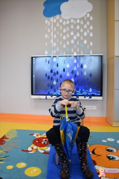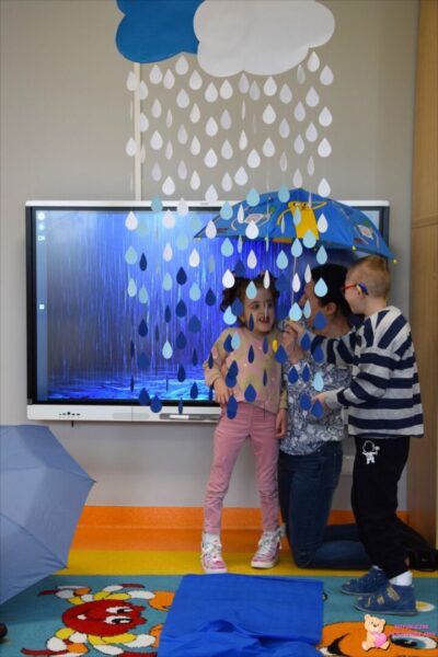 W tym tygodniu grupa Żabek dowiedziała się skąd się bierze deszcz. Adekwatnie do panującej za oknem pogody przedszkolacy przenieśli się w deszczowy świat. Poznali strój, który powinni nosić w deszczową pogodę. Pod względem koloru segregowali kalosze, a pod względem wielkości chmury. Przy użyciu Magicznego Dywanu w Sali Doświadczania Świata mogli poczuć się jak „Żabki w wodzie” chodząc po „kałużach”. A pewnego dnia deszcz pojawił się w sali Żabek. Przedszkolacy musieli założyć kalosze i rozłożyć parasole, żeby się nie pomoczyć