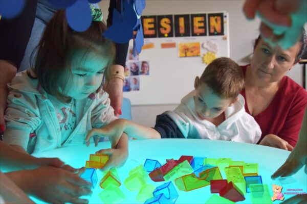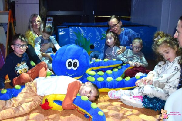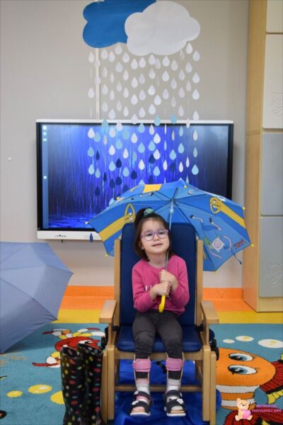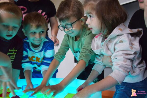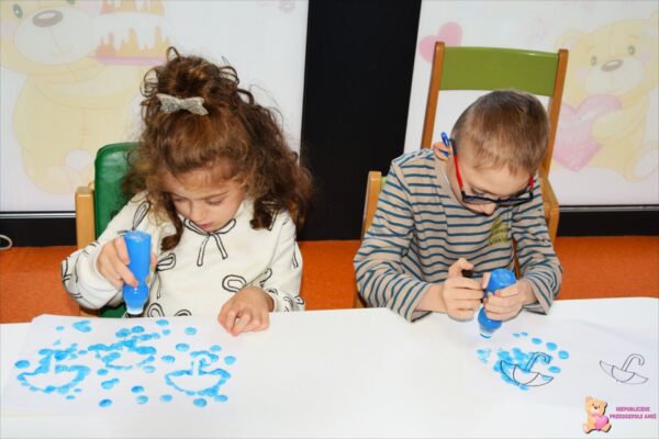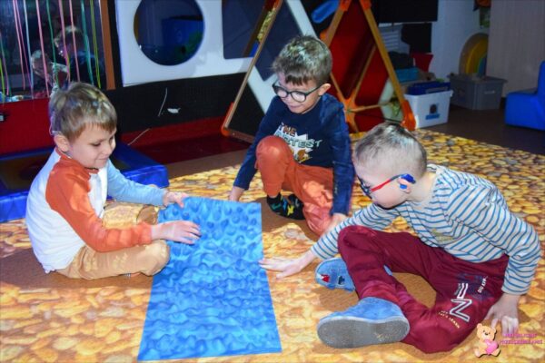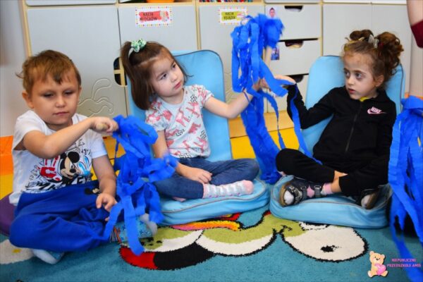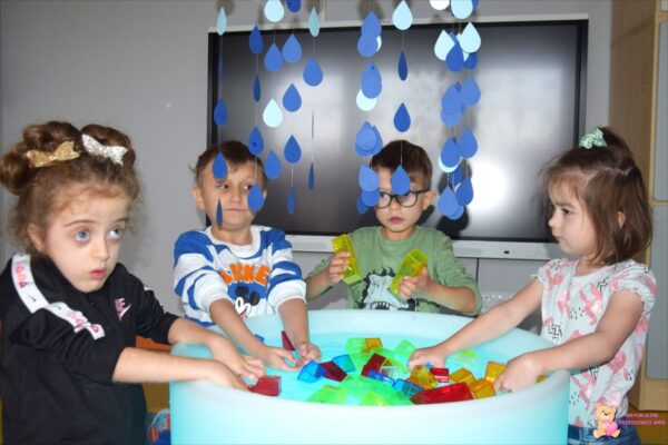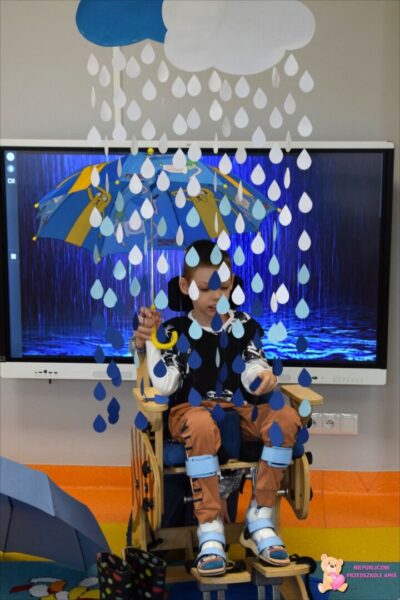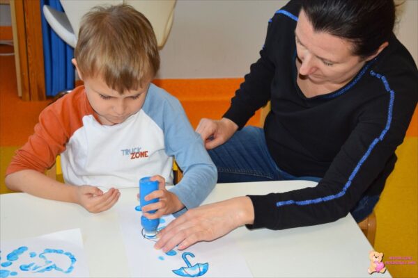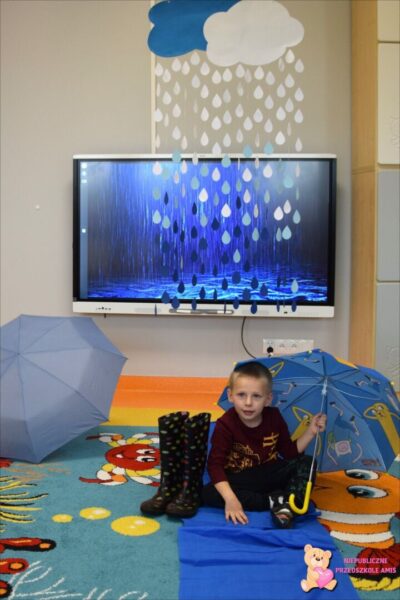 . Amisie wykonały prace plastyczną stemplując parasole. Najwięcej radości sprawiło dzieciom układanie klocków w wodzie na sensorycznym podświetlanym wodnym stoliku. Oczywiście nie zabrakło deszczowych piosenek, przy których przedszkolacy tańczyli i śpiewali. To był bardzo wesoły i „mokry” tydzień.