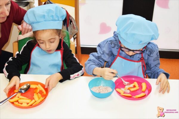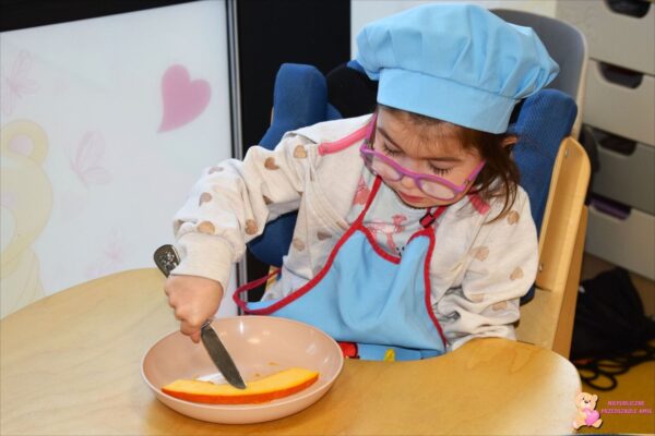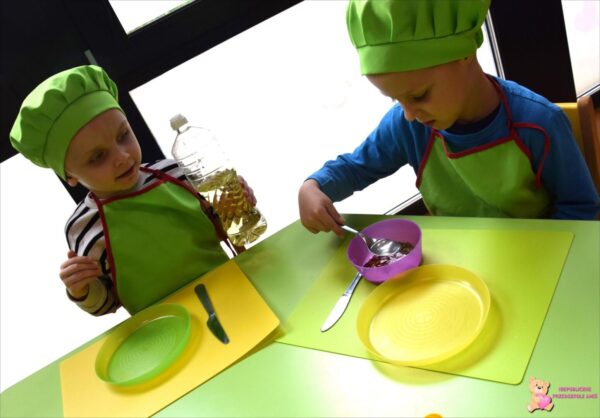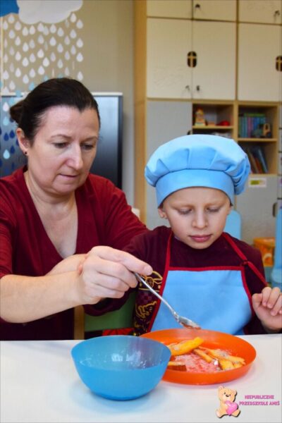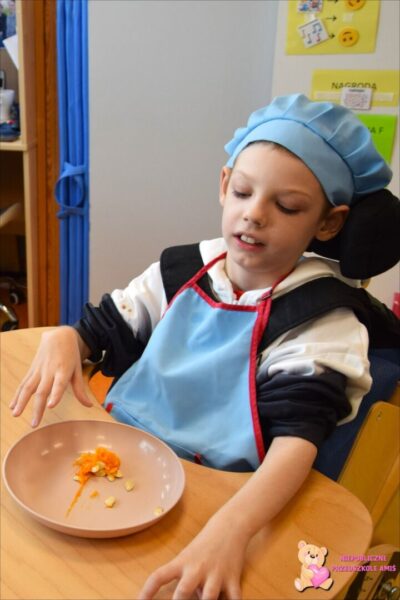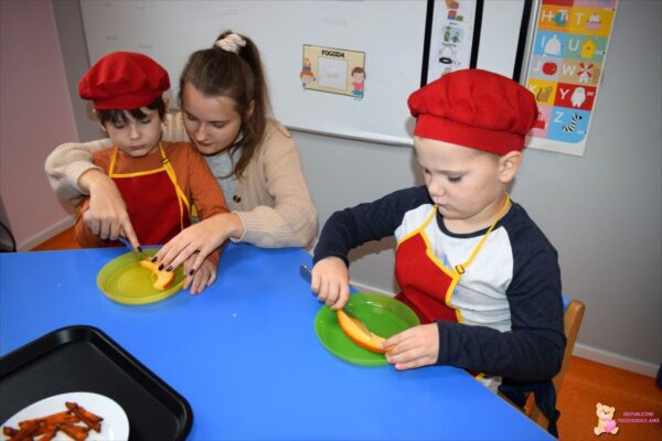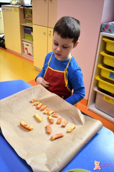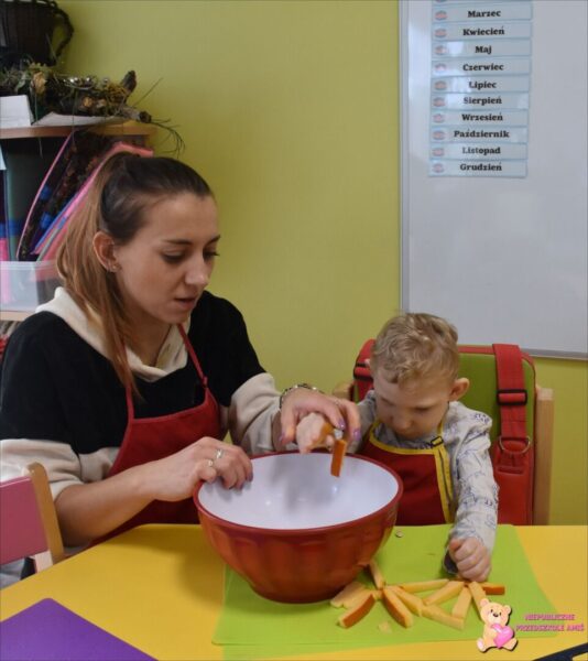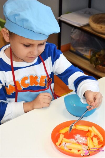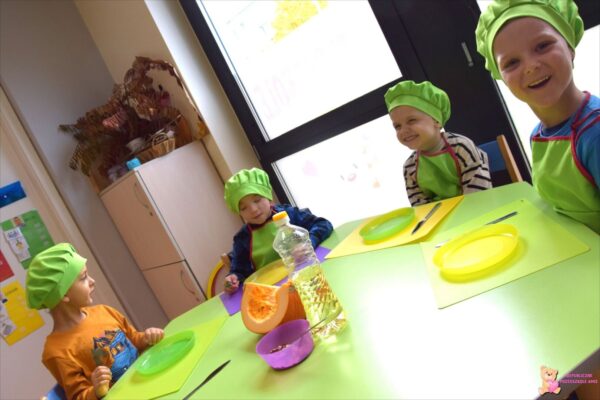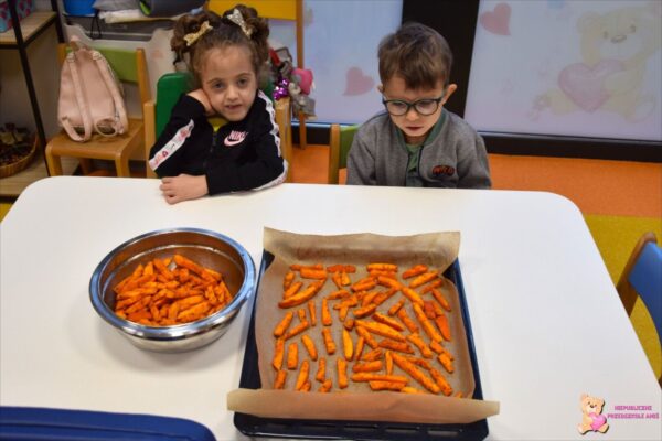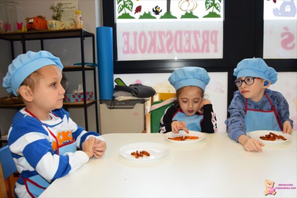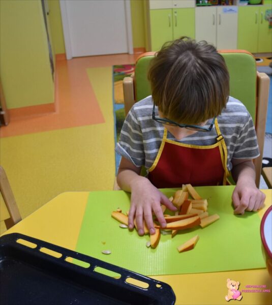 Przedszkolacy wydrążyli miąższ z dyni i pokroili ją na małe kawałki w kształcie frytek. Następnie w małej miseczce wymieszali przyprawy: oregano, słodką paprykę, pieprz, czosnek, po czym dodali skrobię ziemniaczaną. Przygotowane frytki dzieci obtoczyły w przyprawach, a następnie upiekły w piekarniku. Amisiaki odkryły swój przysmak w innej odsłonie. To było niezapomniane doświadczenie smakowe i sensoryczne.