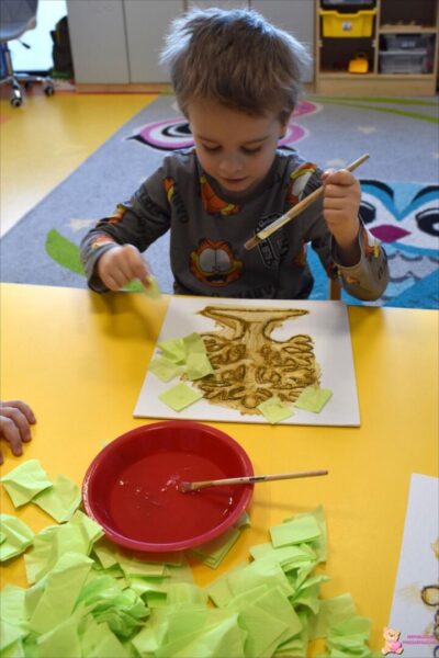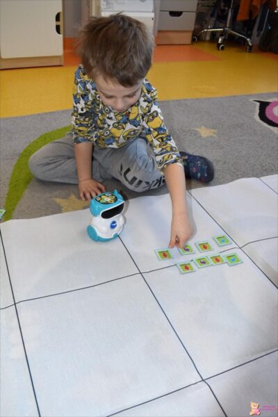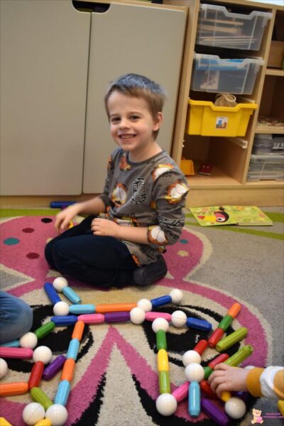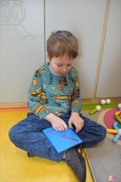uczyła się w przestrzeni od własnego ciała ( góra, dół, prawa, lewa) za pomocą robota edukacyjnego. Wspólnie bawiliśmy się geoplanem, gdzie układaliśmy ciekawe wzory za pomocą kolorowych gumek. Wiele radości sprawiło nam zabawa z klockami magnetycznym. Wykonaliśmy również prace plastyczną polegającą na pomalowaniu konturu drzewa i wyklejeniu tła zielonymi serwetkami.