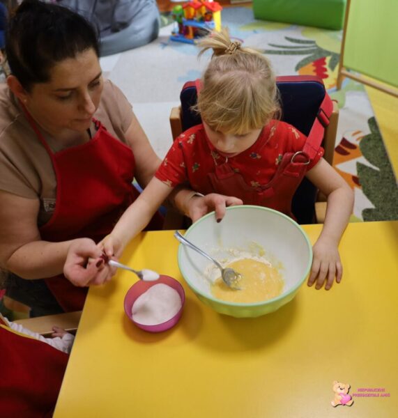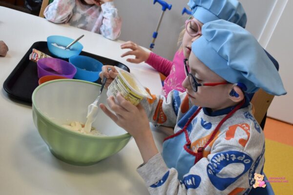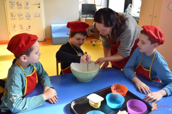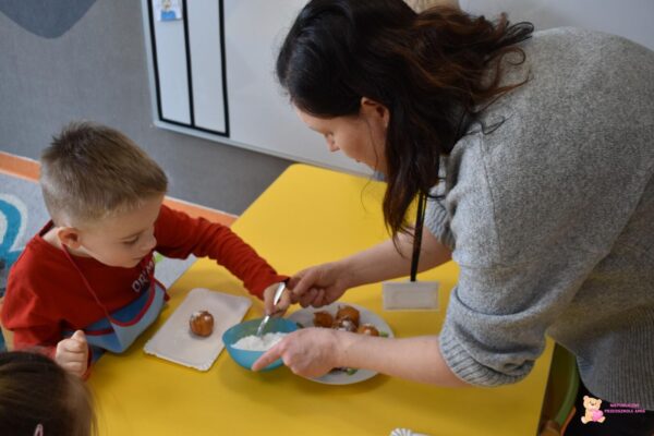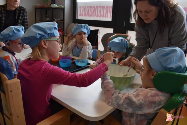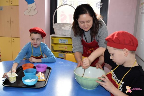 Zgodnie z tradycją przedszkolaki na zajęciach kuchcikowa wzięły się do pracy i z pomocą cioć wykonały pączki serowe, a następnie zjadły je ze smakiem. W tym dniu było słodko, pachnąco i radośnie.