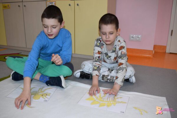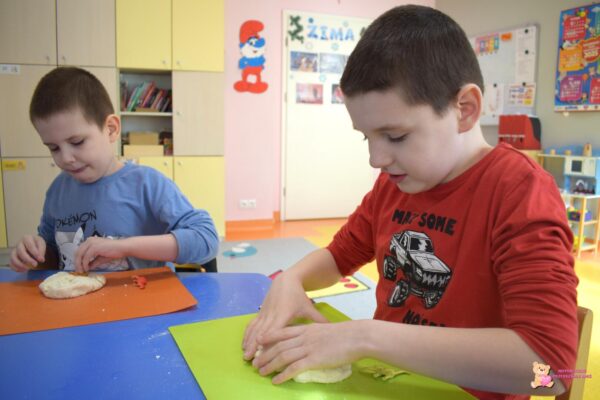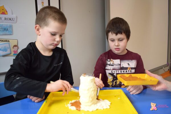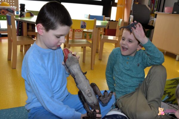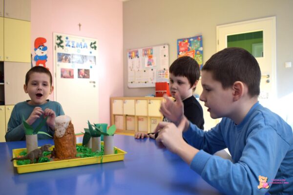 W tym tygodniu grupa „Zajączków” wzięła udział w fascynujących zajęciach o dinozaurach🦖, które na długo pozostaną w ich pamięci. Dzieci miały okazję poznać nazwy różnych dinozaurów🦕, oglądając kolorowe ilustracje i zdjęcia tych prehistorycznych stworzeń. W ramach zajęć przedszkolaki zakładały specjalne okulary 3D🕶, dzięki którym mogły zobaczyć dinozaury w przestrzennych obrazach. Kolejnym etapem zajęć było układanie obrazków dinozaurów od najmniejszego do największego, co pozwoliło lepiej zrozumieć różnice w wielkości. Chłopcy poczuli się jak prawdziwi paleontolodzy tworząc skamieliny z masy solnej i odciskając w niej różne elementy i kształty. Na zakończenie tygodnia dzieci przygotowały makietę wulkanu, a efekt końcowy w postaci jego wybuchu wzbudził podziw wśród całej grupy. 🙂