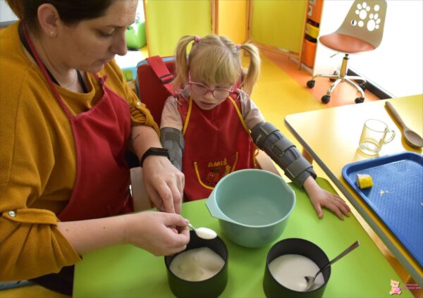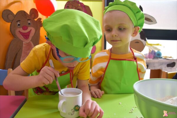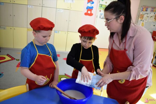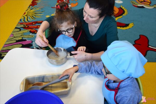 , który jest jednym ze składników wielkanocnego koszyczka. Wszystkie dzieci z zaangażowaniem zabrały się do pracy. Mieszały składniki, wylewały do formy i pomocą cioć chlebki