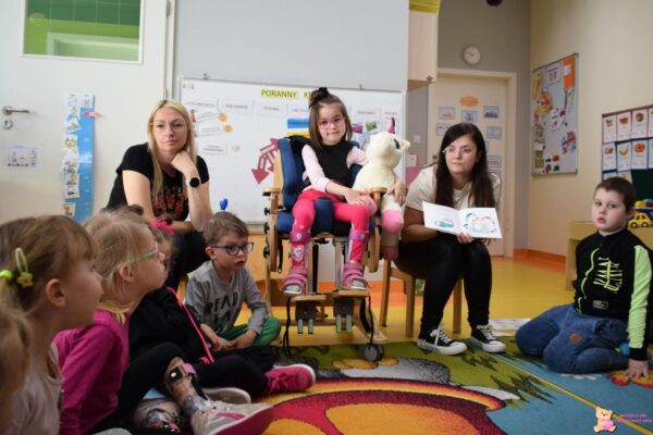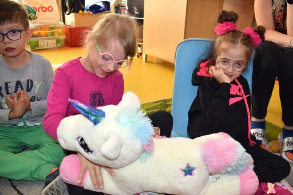 Dziś nasze przedszkolaki wzięły udział w kolejnym spotkaniu Międzynarodowego Projektu „Kolorowe uczucia Gucia, którego celem jest wspieranie rozwoju emocjonalnego dzieci poprzez zabawę i opowieści🙂. Zajęcia rozpoczęły się od ciepłego powitania 👋pluszowego bohatera – jednorożca Gucia. Dzieci z ogromną radością tuliły pluszowego przyjaciela, a także uważnie słuchały historii o tym, jak Gucio uczył się być miłym, uprzejmym i życzliwym wobec innych🙂.