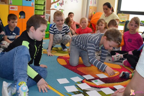 W kolejnej części zajęć przedszkolaki wzięły udział w zabawie memory, podczas której odkrywały karty z Guciem ukrytym w różnych miejscach względem skrzynki – na niej, pod nią i obok niej. Dzięki temu nie tylko świetnie się bawiły, ale także uczyły się orientacji przestrzennej oraz wzbogacały słownictwo opisujące relacje przestrzenne. Dziękujemy Guciowi za odwiedziny i już nie możemy się doczekać kolejnych przygód z naszym kolorowym bohaterem!😊