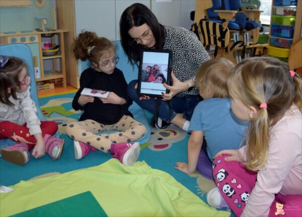 W ubiegły tygodniu tematem wiodącym była nasza rodzina. Z tej okazji dzieci przyniosły do przedszkola rodzinne albumy, zdjęcia. Była to dla nas okazja, aby przedstawić swoich bliskich, opowiedzieć kim są. Dzieci wskazywały też na mówkach osoby z swojej rodziny