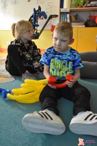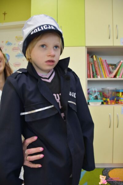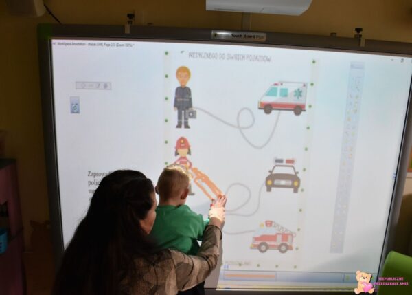 W ubiegłym tygodniu tematem zajęć dydaktycznych były służby ratunkowe. Przedszkolaki wysłuchały opowiadania pt. „Wizyta u strażaków” –M. Krzemińskiej, następnie na tablicy multimedialnej łączyły ze sobą zdjęcia osób z właściwymi pojazdami. Brudząc swoje małe rączki powstała praca plastyczna w postaci „lizaka policjanta”, dowiedzieliśmy się również jakie atrybuty potrzebuje strażak, policjant oraz lekarz. Na koniec mogliśmy przymierzyć strój policjanta.
