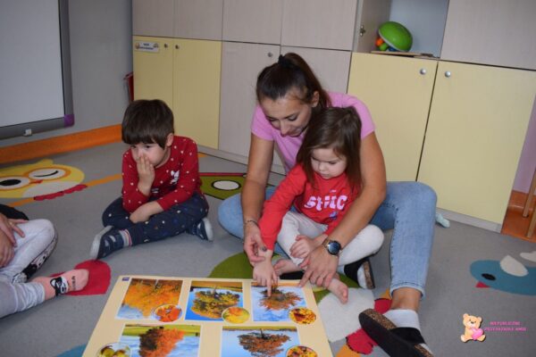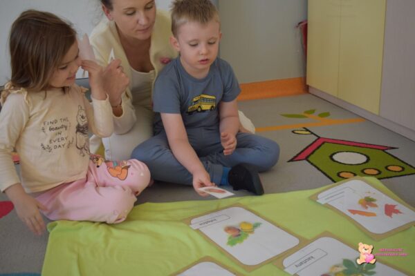 W tym tygodniu przedszkolaki z grupy Promyczków poznawały dary jesieni. Dzieci z pomocą nauczyciela dopasowywały obrazki do odpowiednich plansz. Podczas gimnastyki buzi i języka dzieci dmuchały przez słomkę w celu wprawienia w ruch jesiennych liści.