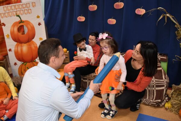 W dniu dzisiejszym w przedszkolu Amiś obchodziliśmy podwójne święto: „Dzień Dyni” oraz przyjęcie do grona Amisiaków nowych dzieci. Dla Julii i Kacpra z grupy „Żabek” był to ważny dzień, bo to właśnie oni dołączyli do swoich koleżanek i kolegów podczas pasowania na przedszkolaka. Nasze święto rozpoczęło się od wspólnego muzykowania – zaśpiewaliśmy piosenkę pt. ”Przedszkolak” oraz graliśmy w rytm jej melodii na instrumentach. Po krótkim występie nastąpiło pasowanie nowych przedszkolaków. Poprzez dotknięcie magiczną kredką ramienia Julii i Kacpra Pan Prezes Fundacji AMI – Arkadiusz Rutkowski przyjął ich do grona Amisiaków. Dzieci otrzymały medale oraz upominki. Julii i Kacprowi z grupy „Żabek” życzymy samych sukcesów i wspaniałych chwil w naszym przedszkolu.
