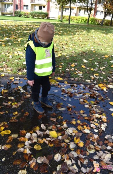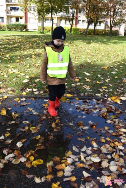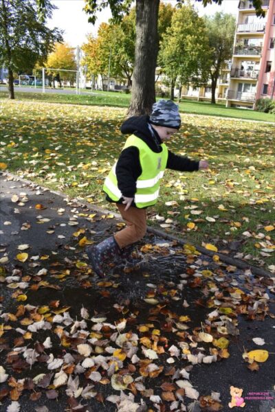 do piosenki pt. „ Kropelki wody”. Zaznaczaliśmy odpowiednie ubranie, wskazywaliśmy duże i małe kalosze oraz poznaliśmy na planszy z czego powstaje deszcz. Podczas spaceru skakaliśmy radośnie po kałuży.