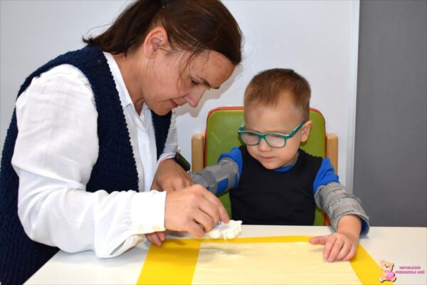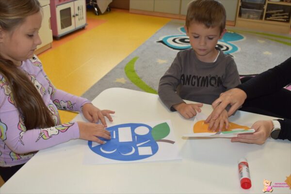 Zajęcia dostarczyły dzieciom wielu wrażeń sensorycznych, rozwijały ich sprawność manualną oraz poszerzały wiedzę o darach jesieni. Dodatkowo uczyliśmy się figur geometrycznych, dopasowując i przyklejając je do owocu.