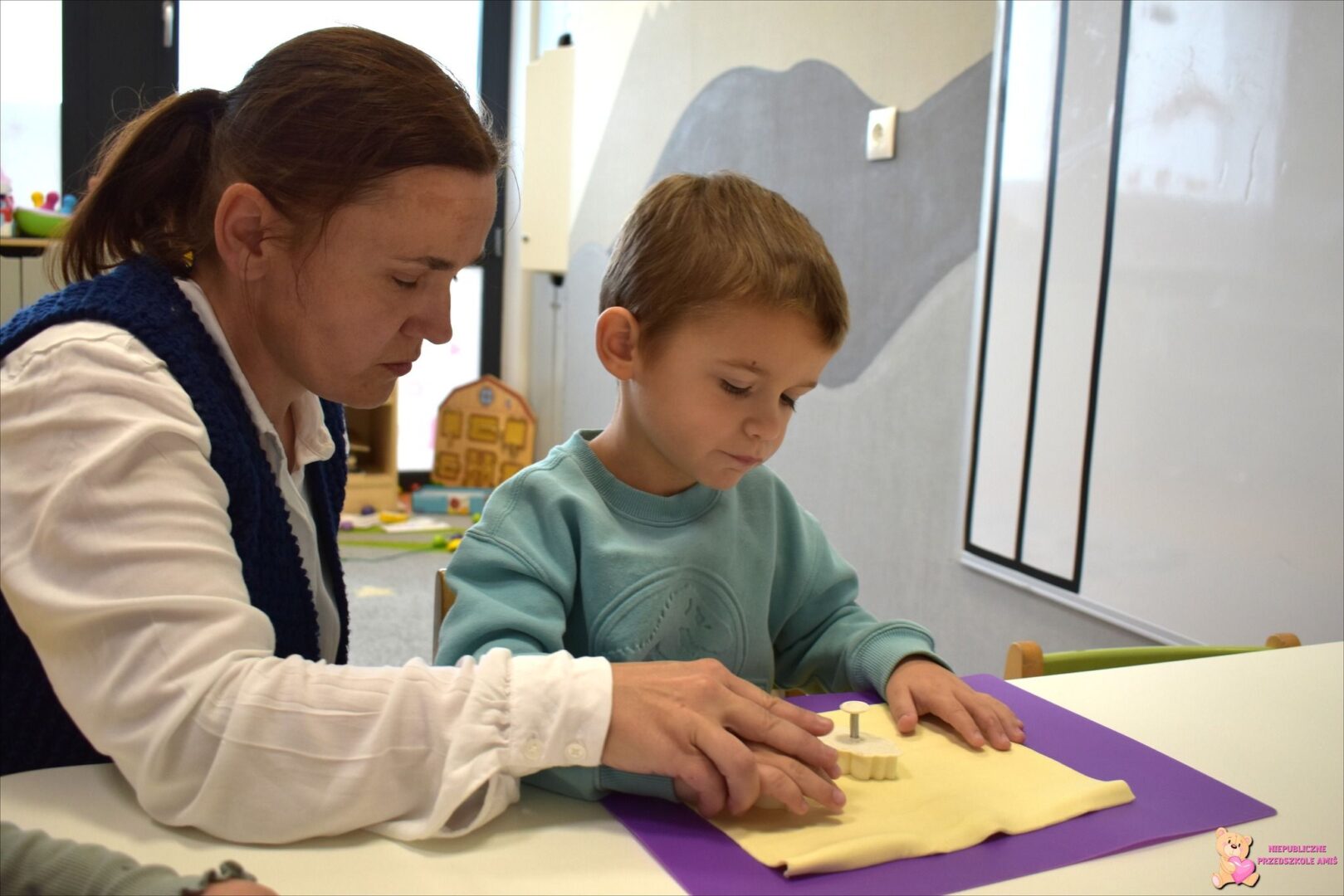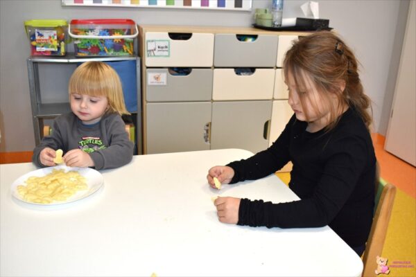 W części plastycznej wykonaliśmy prace inspirowane jesienią – malowaliśmy drewniane gruszki. Na zakończenie zajęć przygotowaliśmy pyszne „jesienne liście” z ciasta francuskiego, które dzieci samodzielnie wycinały przy pomocy foremek.