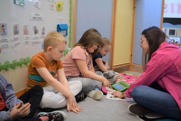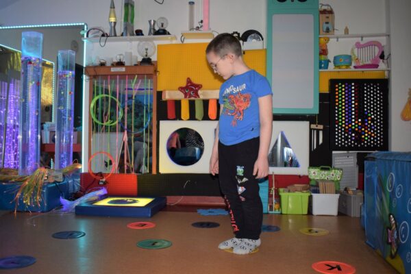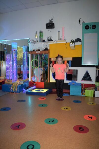 W celu utrwalenia i podsumowania literek, które już poznaliśmy bawiliśmy się w zabawę ruchową, która polegała na skokach na daną planszę zawierającą literkę wypowiedzianą przez Panią.
