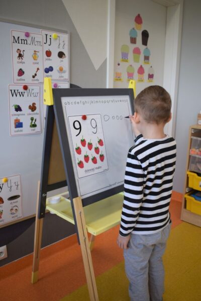 W tym tygodniu poznaliśmy jeszcze liczbę 9. Nauczyliśmy się jej pisać oraz rysowaliśmy 9 przedmiotów na tablicy. Na koniec dodawaliśmy i odejmowaliśmy do 9.