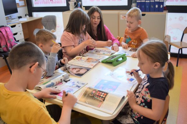 Poznaliśmy monografię literki W na podstawie wyrazów: winogrona, wiewiórka, walizka i wąż. Każdy z wyrazów staraliśmy się literować oraz sylabizować wyszukując nowo poznanej litery. Pani zaprezentowała nam jak wygląda literka drukowana i pisana, a następnie szukaliśmy jej w gazetach.